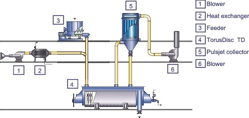 The TorusDisc is the indirect dryer consisting with jacket and torus shaped discs. The material in the dryer receives heat from the outside jacket and the inside discs. The discs cover 80% of the total heating surface. Comparing to the other indirect heating dryer, the TorusDisc has compact design and high thermal efficiency. As the TorusDisc can keep longer residence time, drying at both constant-rate period and decreasing-rate period of drying are possible by one machine. The TorusDisc can cope with drying the material of wide range of moisture contact. The unit can also be used as a cooler by applying water or cooling media.
