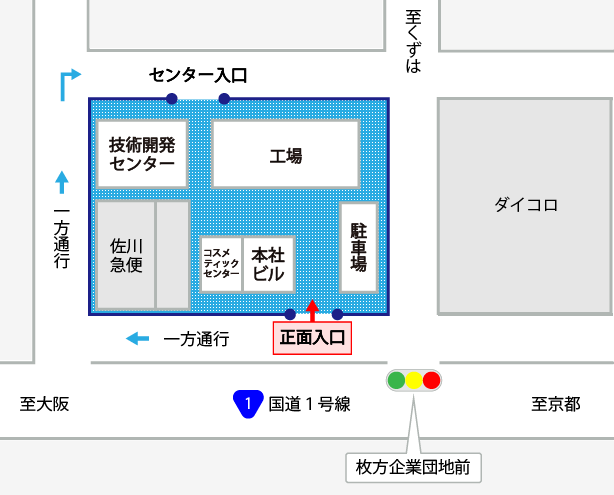 国道1号線「枚方企業団地前」交差点近くの「正面入口」からご来社ください。