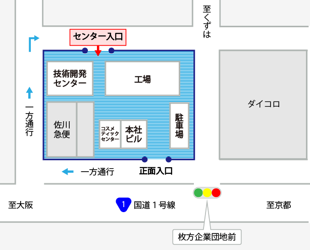 国道1号線「枚方企業団地前」交差点より、地図の水色経路に沿ってお進みいただき、「センター入口」からご来社ください。