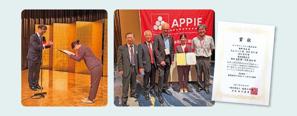 同賞は、粉体工学会が主催する粉体技術セッションにおいて、画期的な技術開発や革新的な応用、その実用性や産業界への貢献度の観点について厳格に評価され、特に優れた成果にのみ授与される栄誉ある賞です。