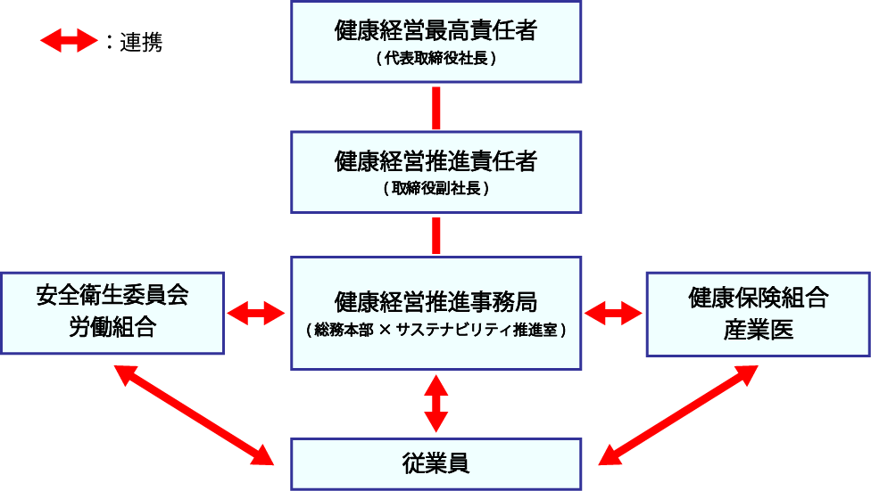 当社では、代表取締役社長を健康経営最高責任者とし、取締役副社長が「健康経営推進責任者」となって健康経営を牽引します。そして、健康経営推進事務局が健康に関する施策立案を行い、各事業所の安全衛生委員会や労働組合、健康保険組合、産業医と連携し、従業員の健康保持や増進に向けた取り組みを推進します。